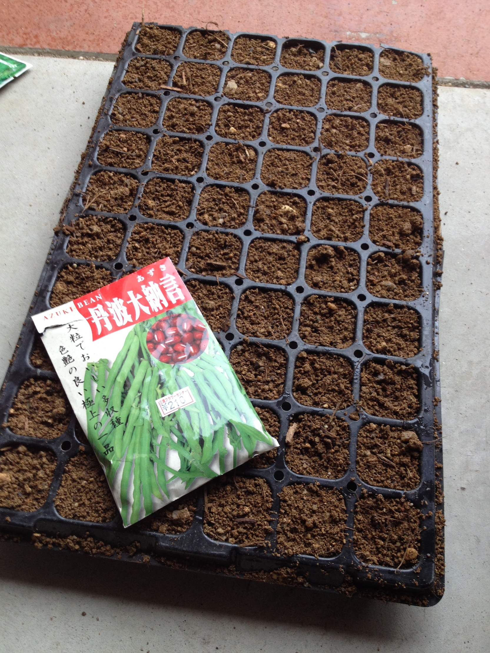自分で育てた小豆で、おぜんざいやらあんぱんやら…、妄想を膨らませてニヤニヤしながら育苗トレーに種まきしました。お祖母さんが言うには、小豆は7月の満月に蒔くと良いそうなんですが、ちょうど土曜日が満月だったので、良いタイミングでした♪