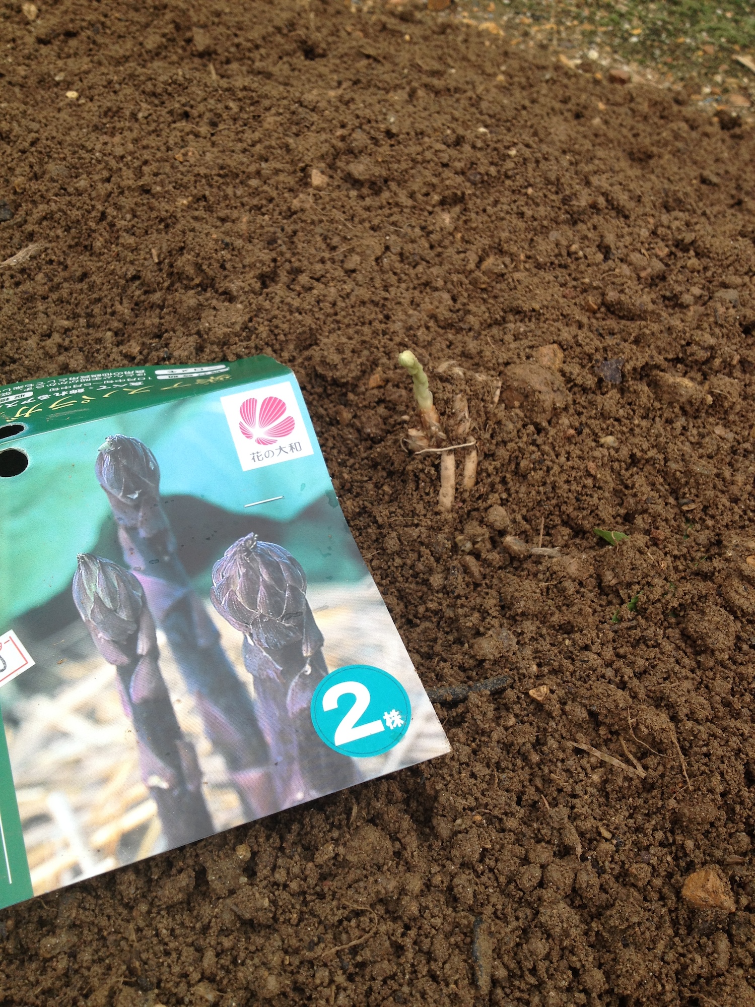 ちょっと時期外れだったからか、半額で売られていた紫アスパラの苗。