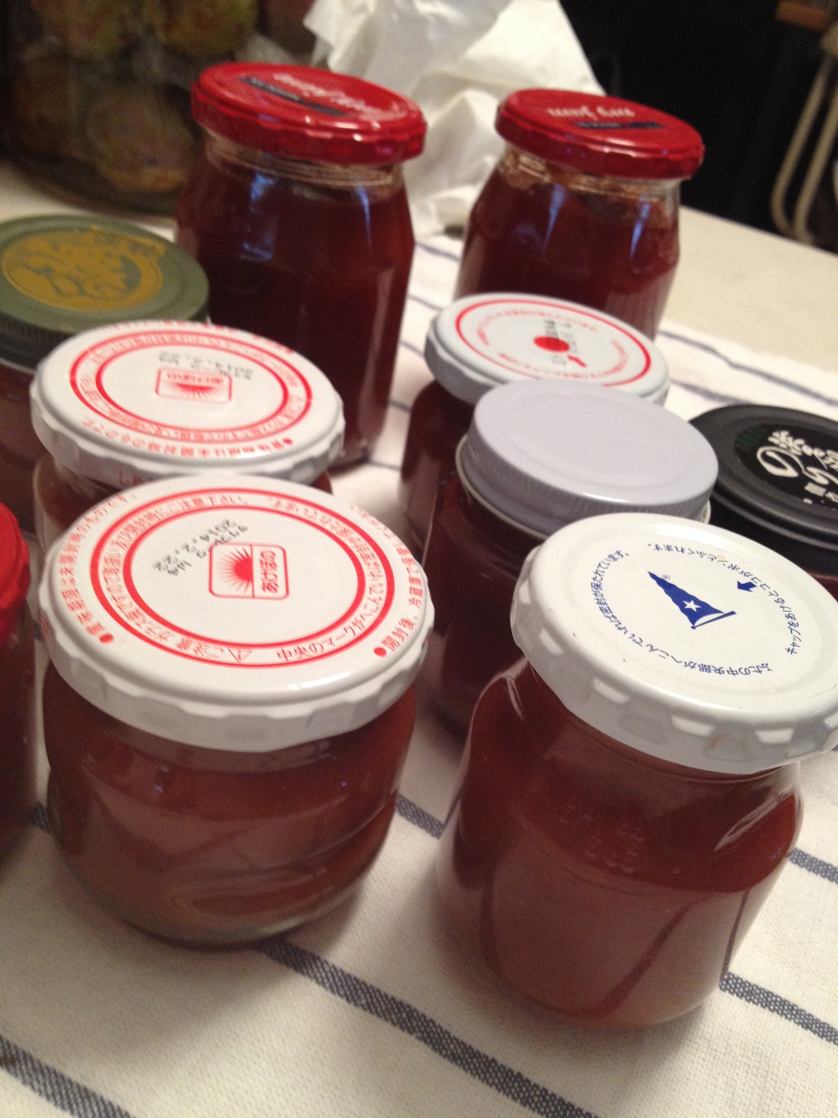 出来上がり。アルコールで消毒した瓶にジャムを詰めて、お鍋で炊いて脱気と殺菌。