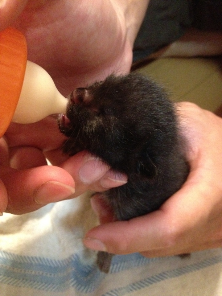 夕方までは触らずに置いていて様子を見ていたのですが、でも、お迎えが来ないので、慌ててミルクと哺乳瓶を買ってきて、なるべく人間の匂いをつけないように、触らないようにしながら、ミルクをあげて、雨が降っても大丈夫なように軒の下のちょっと高さのあるところで、母猫にも見つけてもらいやすいようにして、一晩様子を見たのですが、次の日も同じところで鳴いていました。